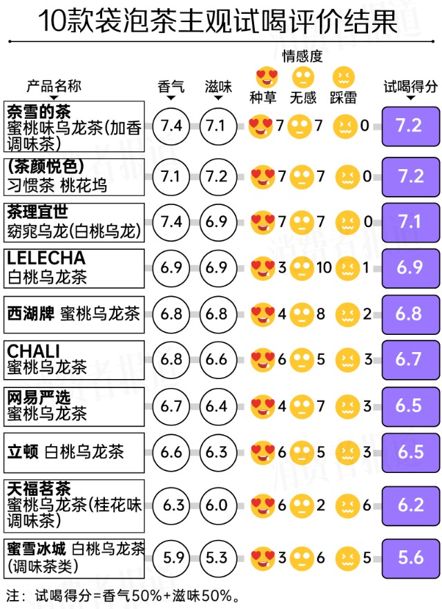 主观测评结果显示,奈雪的茶、茶颜悦色试喝得分均为7.2,志愿者对其香气、滋味认可程度较高,茶理宜世也表现不俗,位列第三。