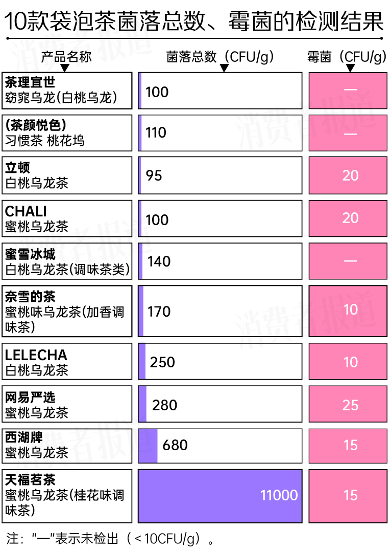 检测结果显示,10款袋泡茶检出菌落总数,7款检出霉菌。