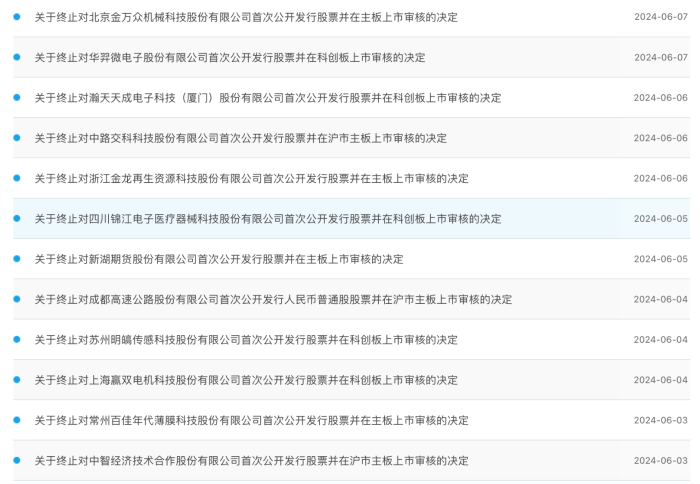 此前一周,沪市就有12家公司终止,深市有7家,就连北交所上周也有3家公司宣布终止上市申请。