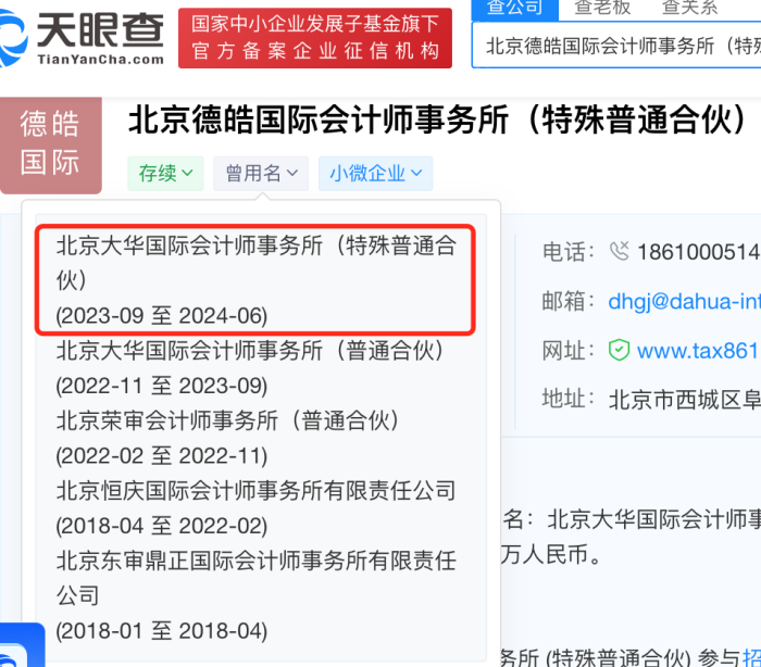 根据天眼查,如今的北京大华国际更名为北京德皓国际会计师事务所(特殊普通合伙),曾用名北京大华国际显示使用时段为2023年9月至2024年6月。