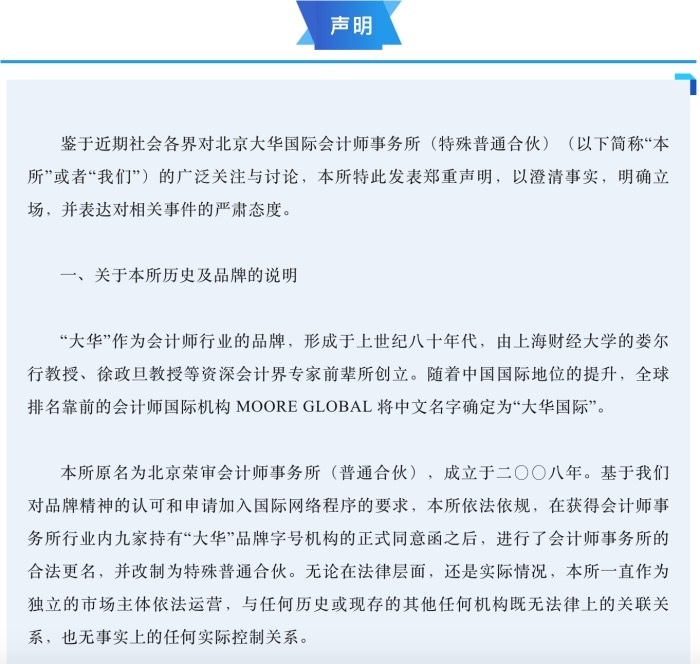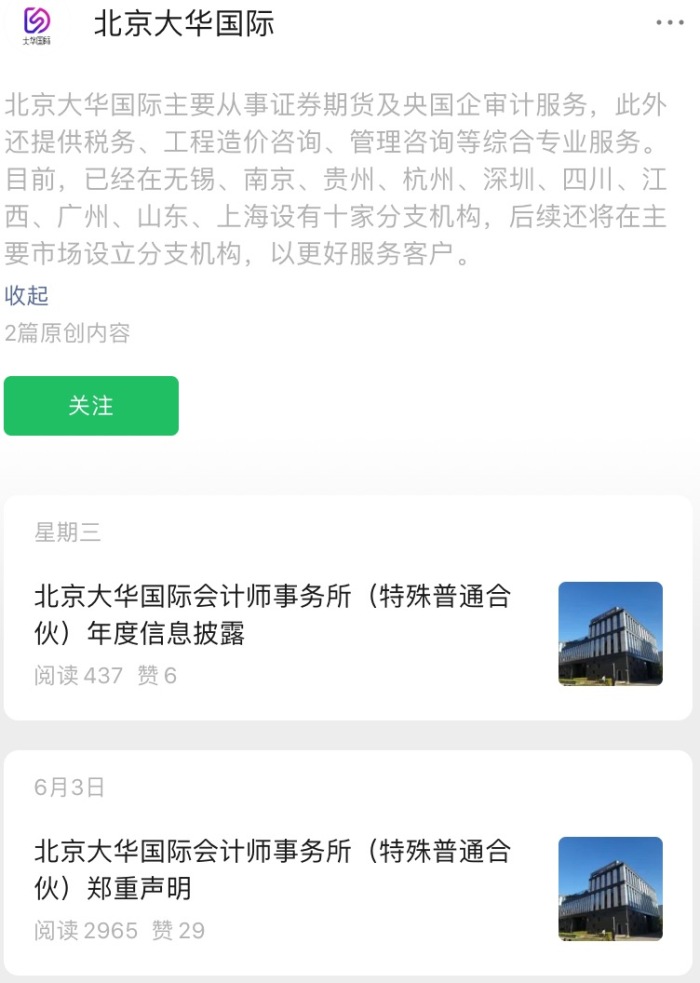 除此外,界面新闻注意到,在大华所事件发酵后,最近又有新的动态。此前界面新闻梳理了相关情况,其中提及的北京大华国际会计师事务所(特殊普通合伙)(下称北京大华国际),近日似出现更名的动作。