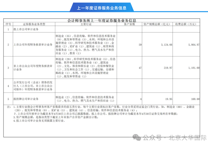 另外根据6月5日北京大华国际发布的“年度信息披露”,事务所上一年上市公司年度财务报表审计业务客户家数59家,收费总额5864.87万元;非上市公众公司年度财务报表审计业务客户家数47家,收费总额1181.6万元;拟挂牌公司审计业务客户家数4家,收费总额160.6万元。